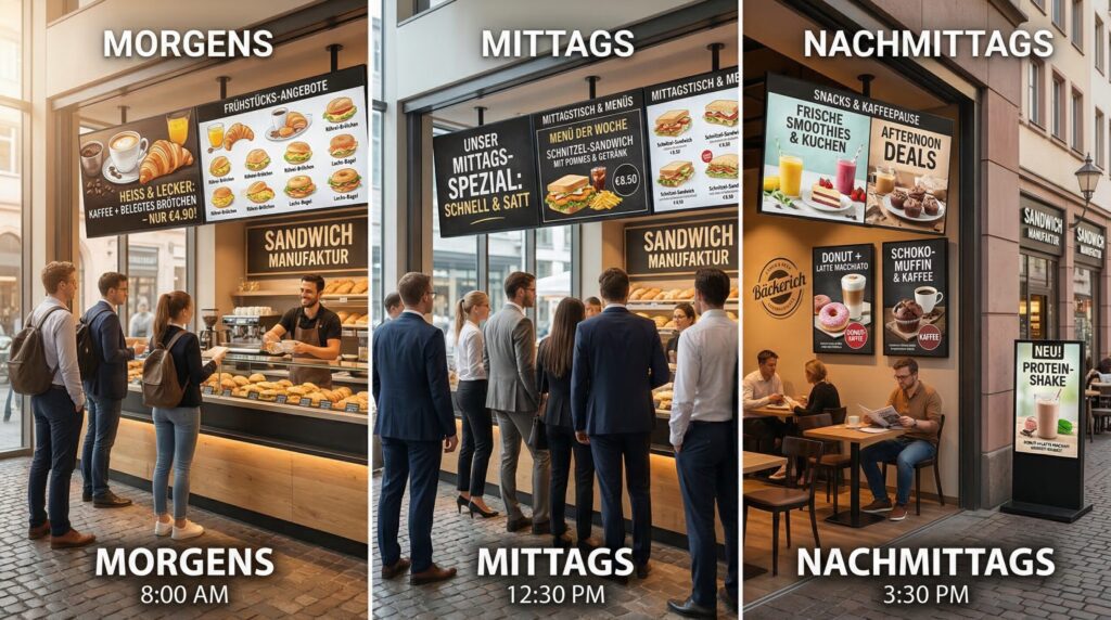 Digitale Displays zeigen frische Sandwiches, Subs und belegte Brötchen in hoher Qualität und mit Bewegung. Dadurch wirken Ihre Produkte deutlich appetitlicher und moderner. Gerade in stark frequentierten Lagen in Deutschland, wie Innenstädten oder Bahnhöfen, ist das besonders wichtig. Denn viele Menschen laufen vorbei und entscheiden spontan.