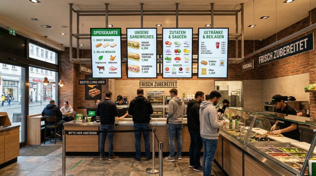 Digitale Signage im Sandwich-Imbiss in Deutschland ist eine moderne Lösung, um mehr Kunden anzusprechen und den Umsatz zu steigern. Gerade bei frischen Sandwiches, Subs und belegten Brötchen ist eine klare und appetitliche Darstellung besonders wichtig. Denn viele Gäste entscheiden spontan – und genau hier helfen digitale Menüboards und Displays, die Aufmerksamkeit gezielt zu erhöhen.