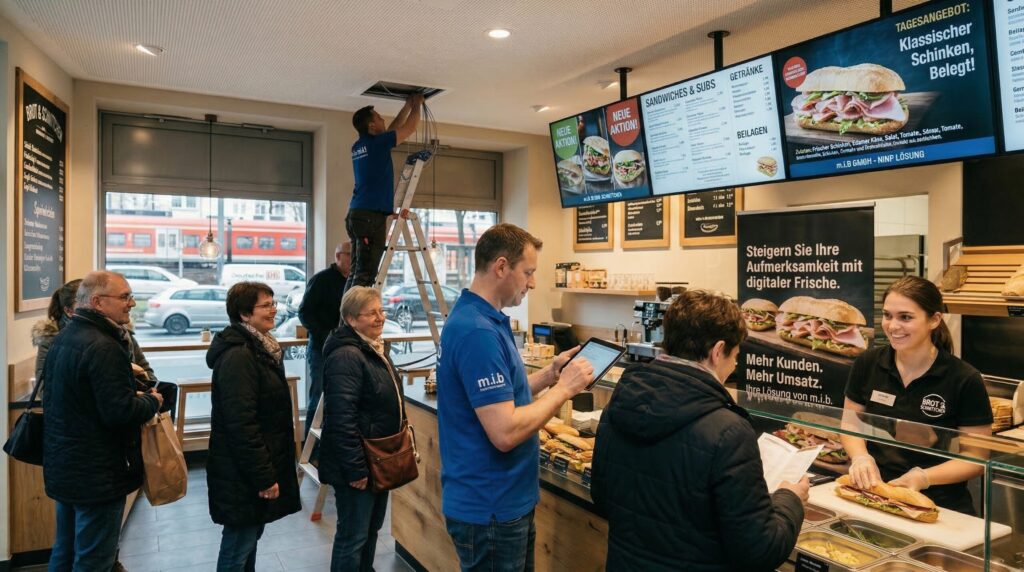Die m.i.b GmbH übernimmt für Sie die komplette Umsetzung Ihrer Digital Signage Lösung im Sandwich-Imbiss in Deutschland – und das einfach, schnell und zuverlässig. Von Anfang an begleiten wir Sie Schritt für Schritt, sodass Sie sich um nichts kümmern müssen.