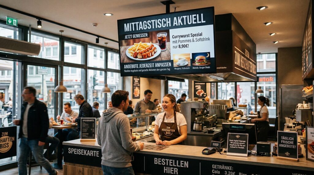 Außerdem erhöht sich die Aufmerksamkeit um bis zu 60 %, weil bewegte Inhalte stärker wahrgenommen werden als klassische Tafeln. Gleichzeitig können durch klare Darstellung die Bestellzeiten um bis zu 20 % reduziert werden, was besonders zu Stoßzeiten für mehr Verkäufe sorgt.