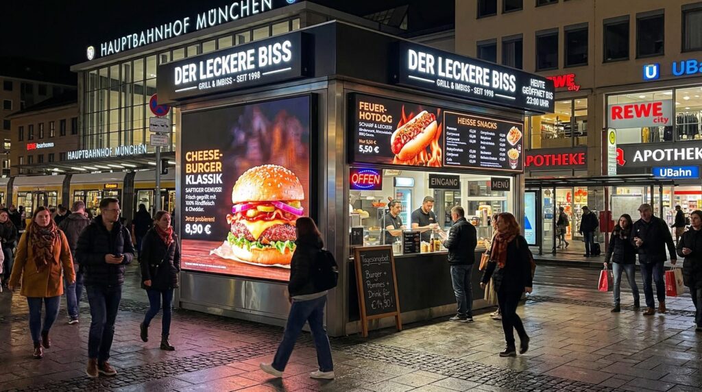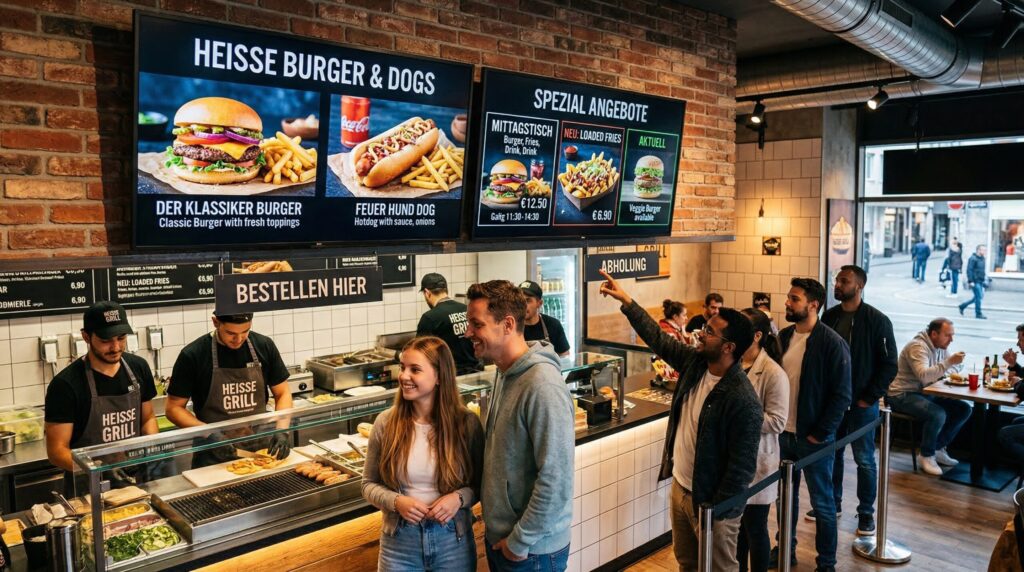 Digitale Displays zeigen hochwertige Bilder und Videos von Burgern, Hotdogs und Menüs. Dadurch wirkt Ihr Angebot frischer, moderner und deutlich ansprechender. Besonders in stark frequentierten Lagen in Deutschland, wie Innenstädten oder Bahnhöfen, ist das ein großer Vorteil. Denn viele Menschen laufen vorbei und entscheiden spontan, wo sie essen.