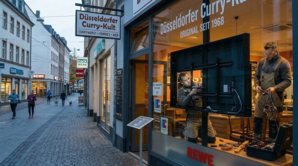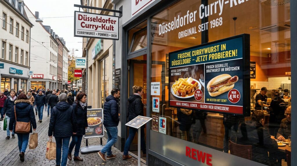 Ein Digital Signage Screen im Schaufenster zeigt klassische Imbissgerichte wie Currywurst mit dampfenden Pommes oder frisch gegrillte Bratwurst. Besonders in stark frequentierten Lagen in deutschen Städten zieht das schnell Aufmerksamkeit auf sich. Mit Botschaften wie „Frische Currywurst in Düsseldorf – jetzt probieren“ werden gezielt Passanten angesprochen. Das sorgt für mehr Sichtbarkeit im direkten Umfeld.