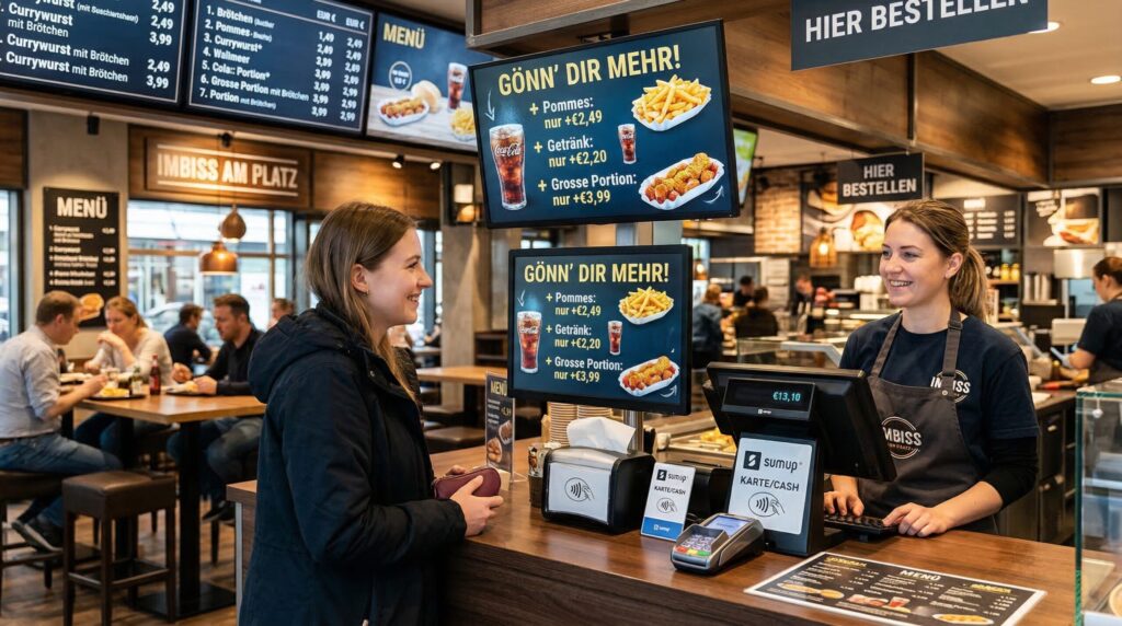 Direkt an der Kasse können kleine Displays Zusatzangebote wie „+ Pommes“, „+ Getränk“ oder „größere Portion“ anzeigen. Kunden sind in diesem Moment besonders offen für einfache Upgrades. Gerade bei klassischen Imbissgerichten lassen sich so schnell zusätzliche Verkäufe generieren. Die Inhalte können je nach Tageszeit oder Angebot angepasst werden.