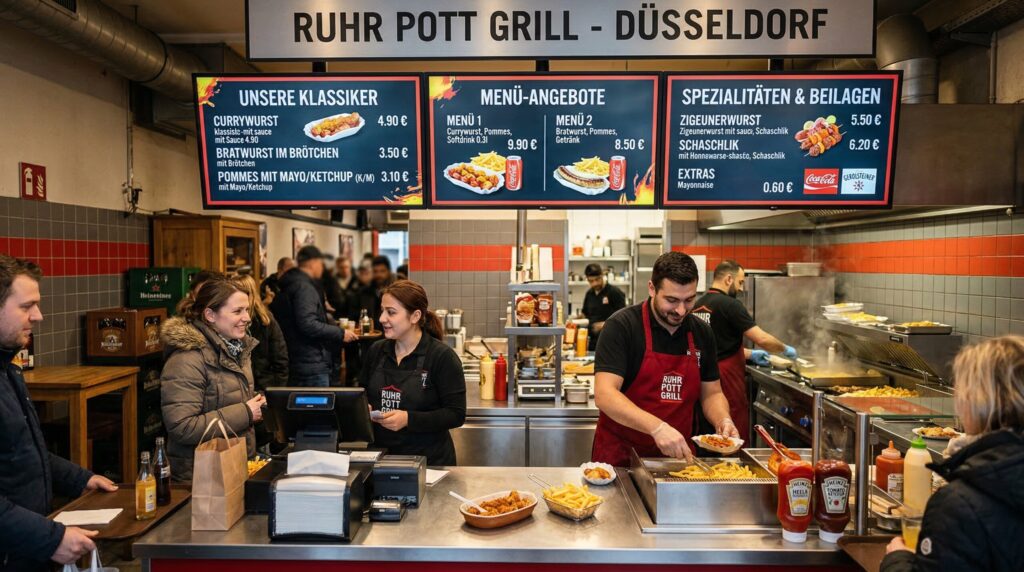 Digitale Menüboards sind in klassischen Imbissen mit Currywurst und Bratwurst in Deutschland, etwa in Düsseldorf, Essen oder Dortmund, besonders praktisch. Sie zeigen die wichtigsten Gerichte wie Currywurst mit Pommes, Bratwurst im Brötchen oder Menüs klar und übersichtlich. Preise und Angebote lassen sich jederzeit schnell anpassen, zum Beispiel bei steigenden Einkaufskosten. Durch einfache, klare Darstellung finden sich Kunden sofort zurecht.