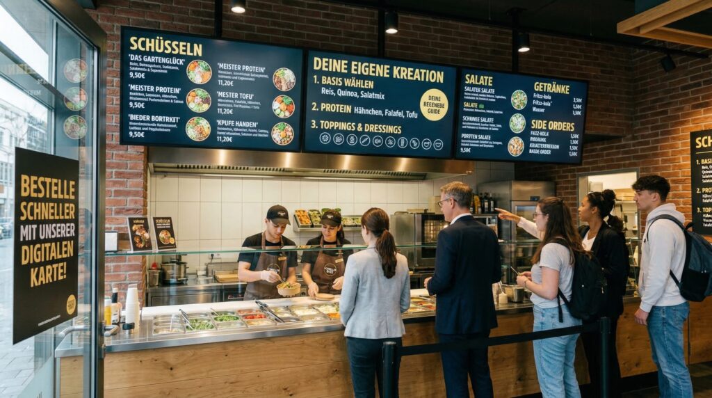 Digitale Menüboards sorgen für eine übersichtliche Darstellung von Zutaten, Kombinationen und Preisen. Kunden sehen sofort, wie sie ihre Bowl oder ihren Salat zusammenstellen können. Dadurch wird der Bestellprozess einfacher und schneller.