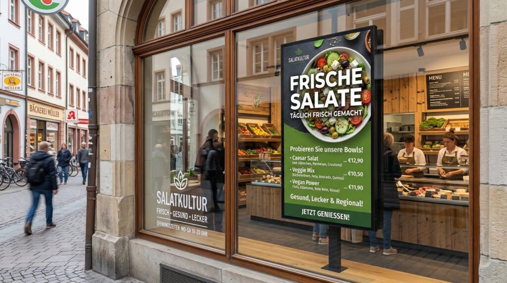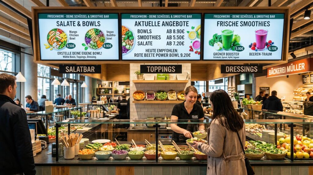 Digitale Displays zeigen frische Salate, bunte Bowls und Smoothies in hoher Qualität und mit Bewegung. Dadurch wirken Ihre Produkte gesünder, frischer und moderner. Gerade in Städten in Deutschland, wo viele Kunden auf gesunde Ernährung achten, ist das ein großer Vorteil. Außerdem ziehen lebendige Bilder mehr Aufmerksamkeit auf sich.