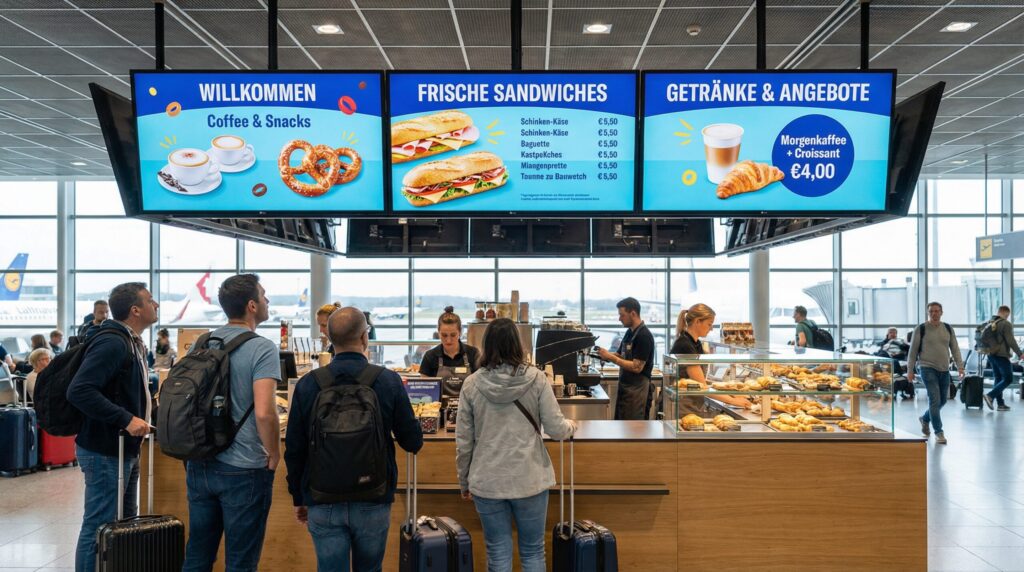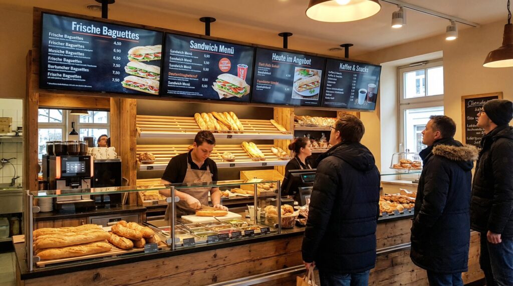 Auch Cafés und Bäckereien setzen zunehmend auf digitale Speisekarten Displays. Hier werden Kaffeespezialitäten, Frühstücksangebote oder Backwaren übersichtlich auf einem digitalen Menüboard Bildschirm dargestellt.