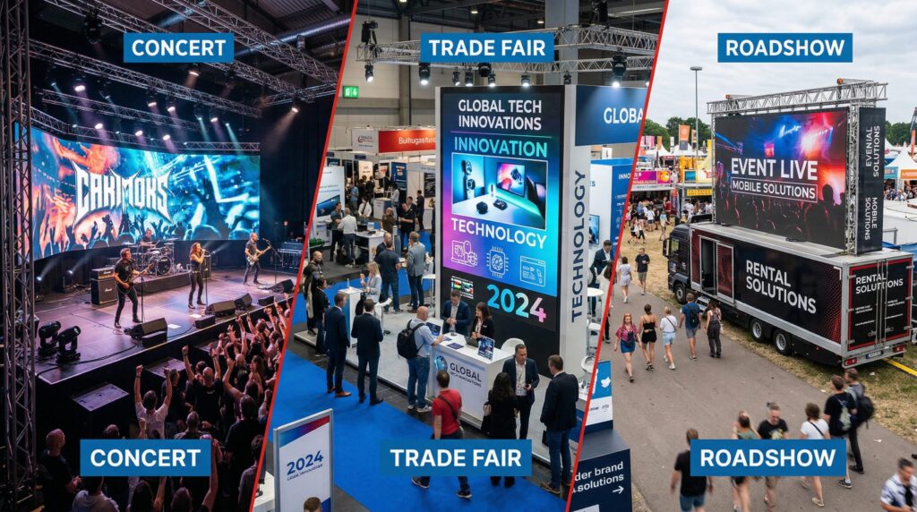 LED-Rental Module sind besonders im Eventbereich und in der Vermietung im Einsatz. Eventfirmen nutzen sie für Bühnen, Präsentationen und visuelle Effekte bei Veranstaltungen. Verleihunternehmen setzen sie ein, um LED-Wände flexibel an Kunden zu vermieten.Auch im Messebau kommen LED-Rental Module zum Einsatz, um Messestände moderner und auffälliger zu gestalten. Unternehmen nutzen sie zusätzlich für Roadshows und mobile Präsentationen.Durch den modularen Aufbau lassen sich die Systeme schnell aufbauen, anpassen und wieder abbauen. Das macht sie ideal für wechselnde Einsatzorte und häufige Einsätze.Ob Events, Messen oder Vermietung – LED-Rental Module bieten eine flexible und professionelle Lösung für den mobilen Einsatz.