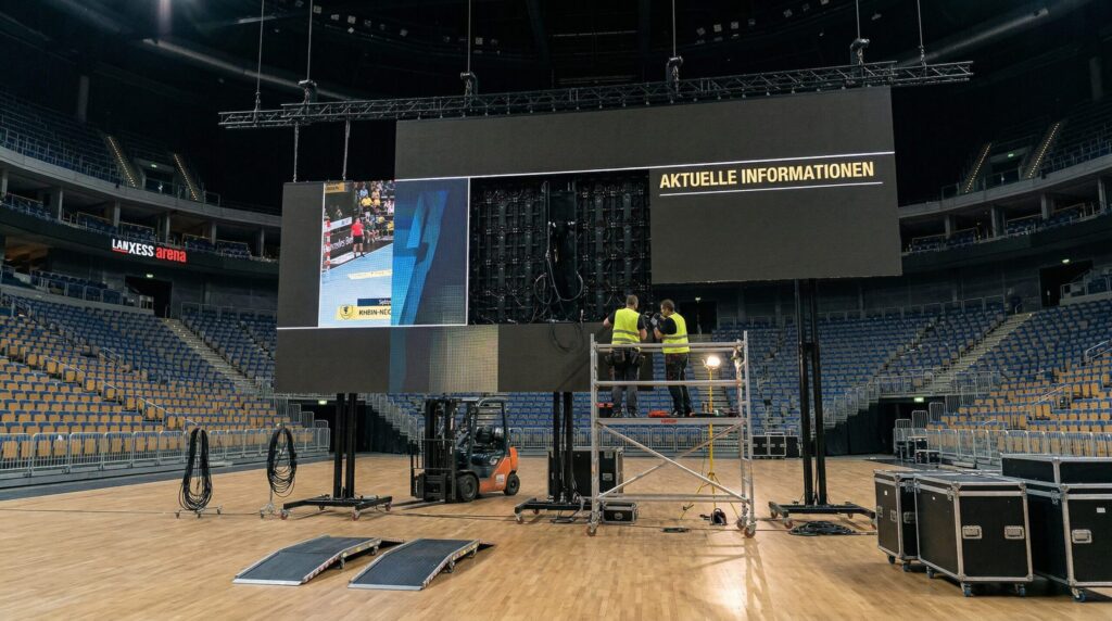 Bei einem Sportevent werden LED-Rental Module eingesetzt, um Live-Bilder, Spielstände, Sponsoren und wichtige Informationen anzuzeigen. Die Module werden rund um die Eventfläche positioniert und sorgen für eine klare Sichtbarkeit für alle Besucher.
